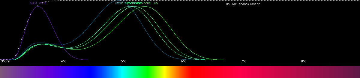 Yellow-Cyan (double cones) 575nm - 533nm - 490nm |